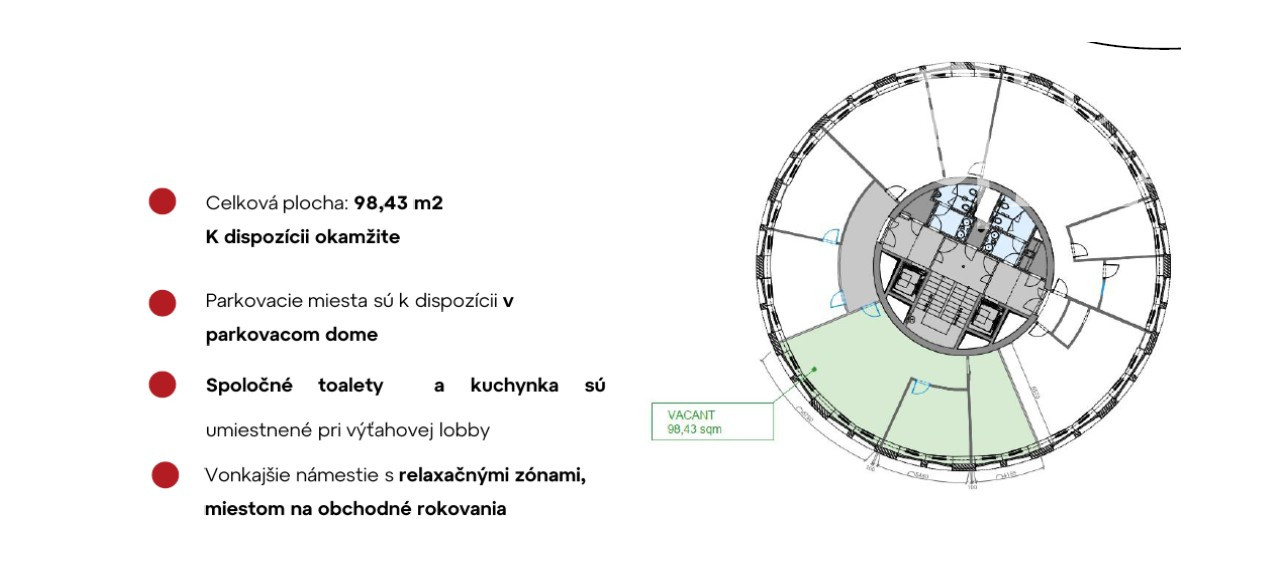 2.posch., blok A - 692 m2 - celé poschodie - voľné od 5/2026 6.posch., blok A - 213,8 m2 - členený kancelársky priestor s terasou 6.posch., blok B - 47,39 m2 - voľné ihneď