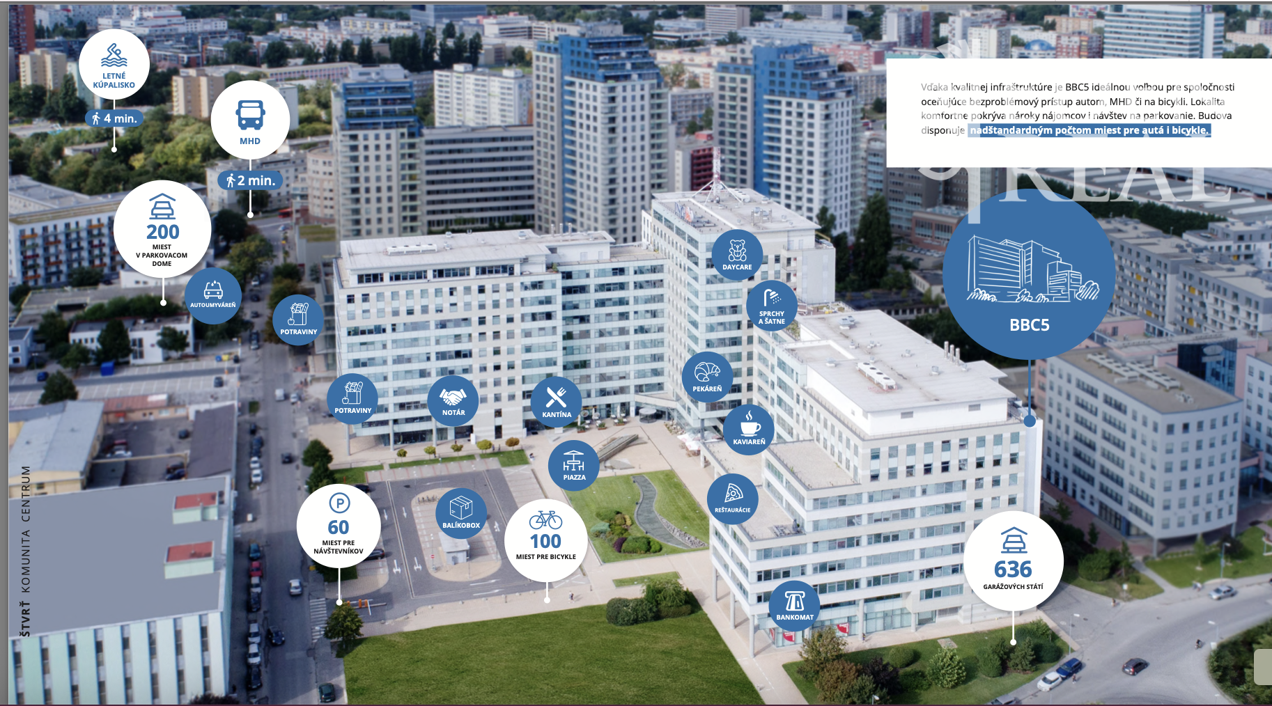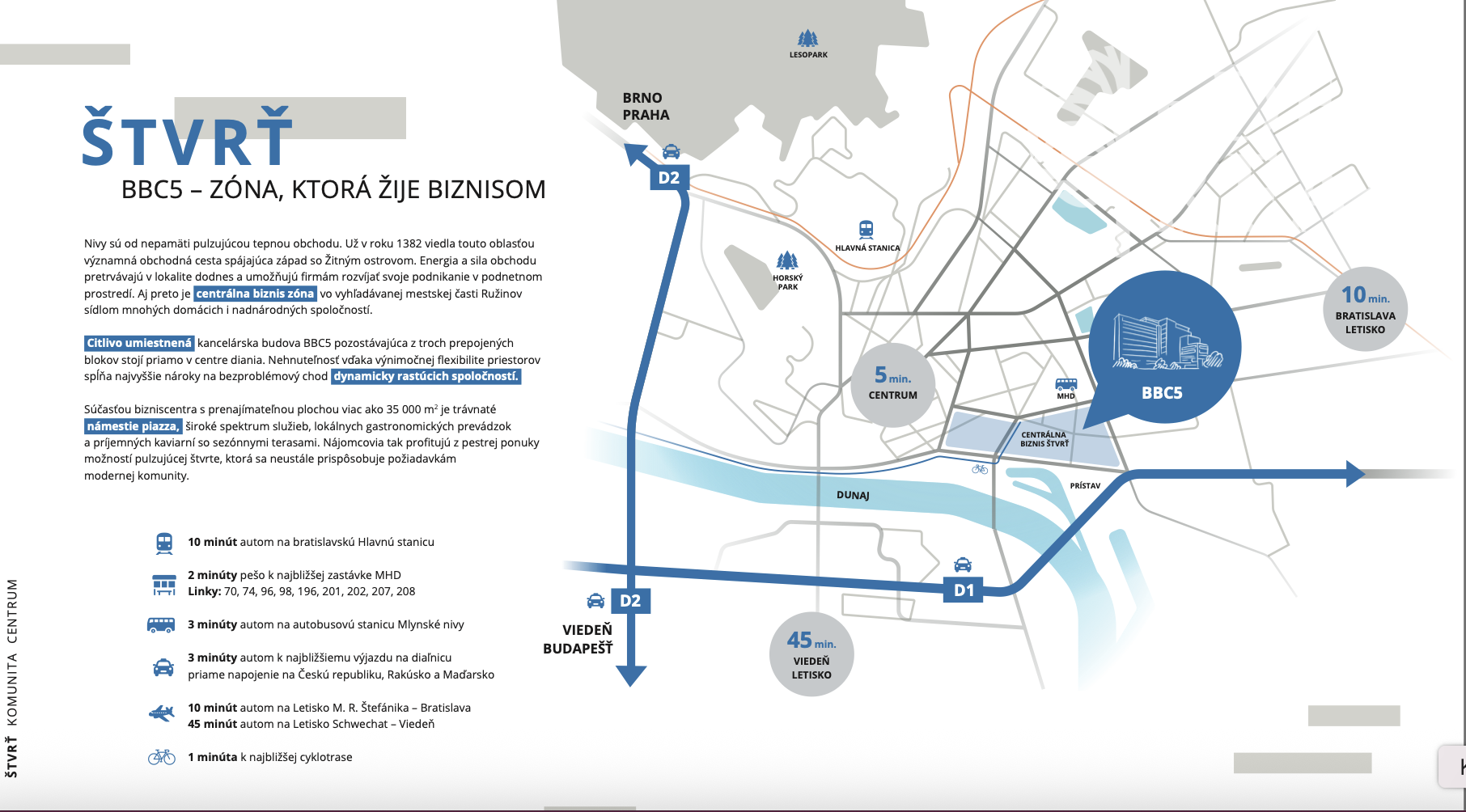 Bratislavská centrálna biznis štvrť je vo vyhľadávanej mestskej časti Ružinov sídlom mnohých domácich i nadnárodných spoločností. Byť v centre bratislavského biznisu bok po boku s najlepšími je presne to, čo priestory v BBC5 ponúkajú: