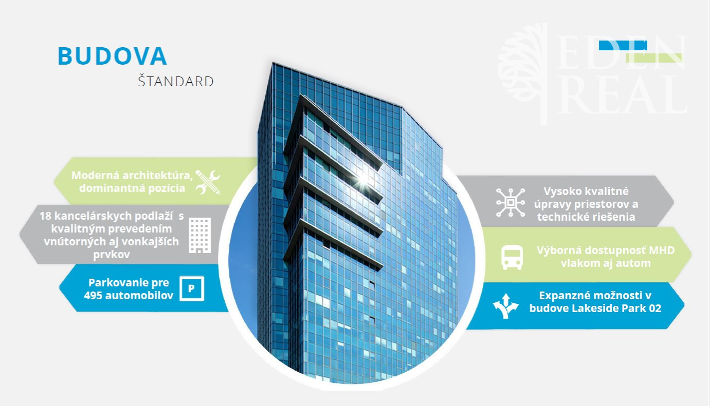 EDEN real ponúka na prenájom nadštandardné administratívne priestory - celok o výmere 1236,88 m2 na 17. posch. Administratívne priestory sa nachádzajú v budove Lakeside Park 01 umiestnenej v obchodnej štvrti s výbornou infraštruktúrou v blízkosti jazera Kuchajda, len 4 km od Starého Mesta.
