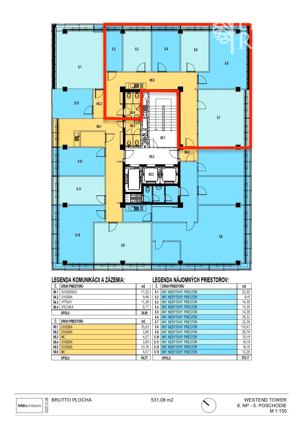 Ponúkaný administratívny celok má výmeru 151,62 m2, pozostáva zo 6 kancelárií, WC, kuchynky a chodbičky, nachádza na 5. poschodí.