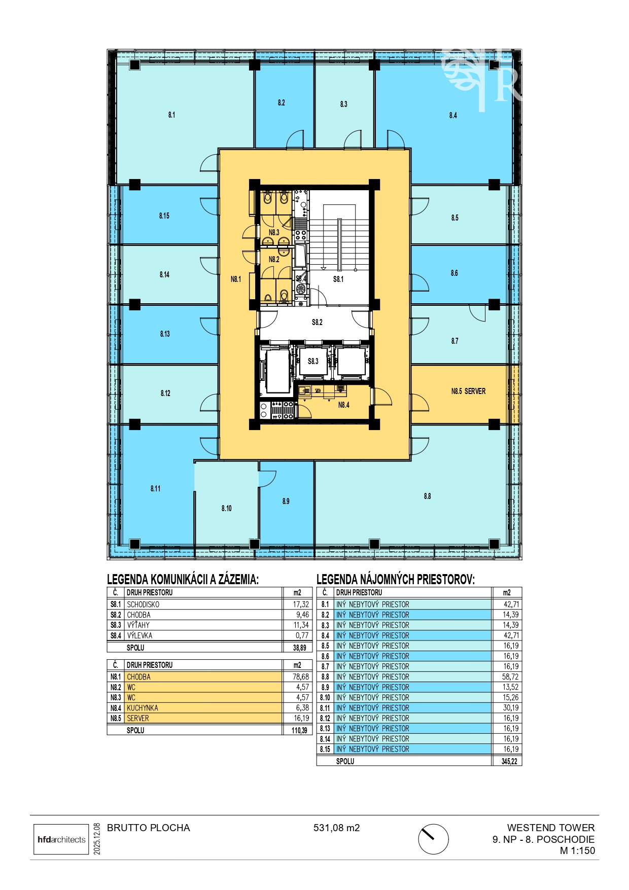 Ponúkaná kancelária má výmeru 42,71 m2, nachádza na 8. poschodí.